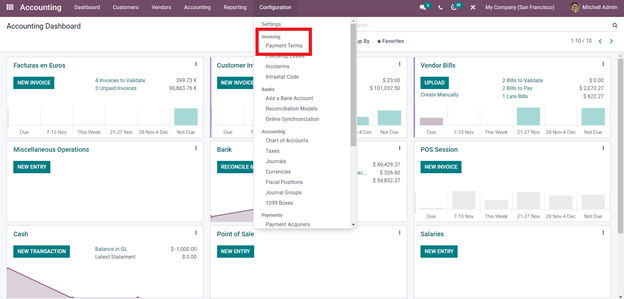 Payment Terms are rules that you can set on an invoice regarding the time allotted to the customer to pay for the product or services you have provided them or give them through invoices professionally. This often allows you to get paid faster and will help your customers to all their purchases quickly. You can easily set this feature up from the Accounting module. Click on the Configuration tab from the module’s dashboard and the drop-down under the Invoice section, click on Payment Terms as shown below.