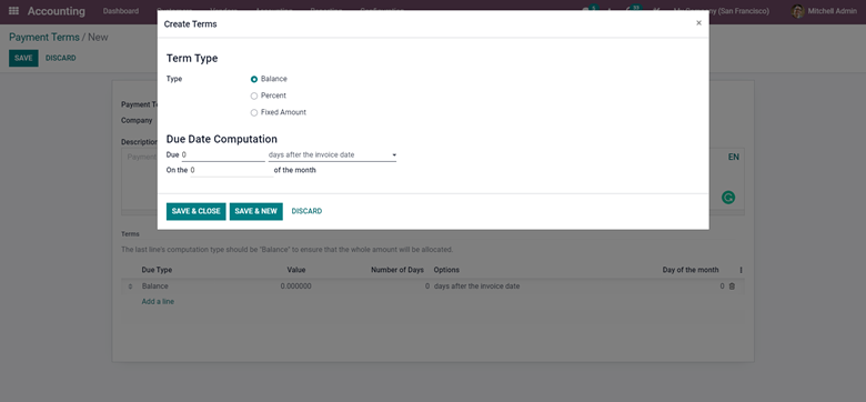 The next step is to configure the Due date computation. The first section under the Due date computation section is the Due. Over here, you have to enter the number of days and the Due, And from the Dropdown options under the Days After the Invoice Date, choose the most appropriate option. The possibilities include Days after the End of the Invoice Month, the following month, or the Current month. After the configuration, use SAVE & CLOSE to continue making the Payment Terms.