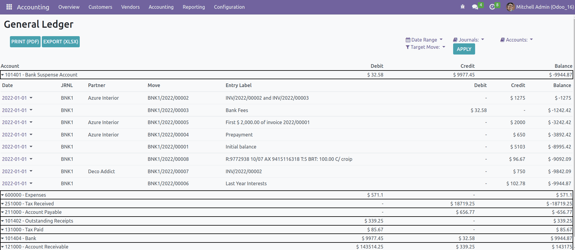 If we go to the General ledger, we can see the reports which can be filtered using data range, journals, analytic accounts, analytic tags, and target move. Also we can print the target in pdf format or xlsx format.