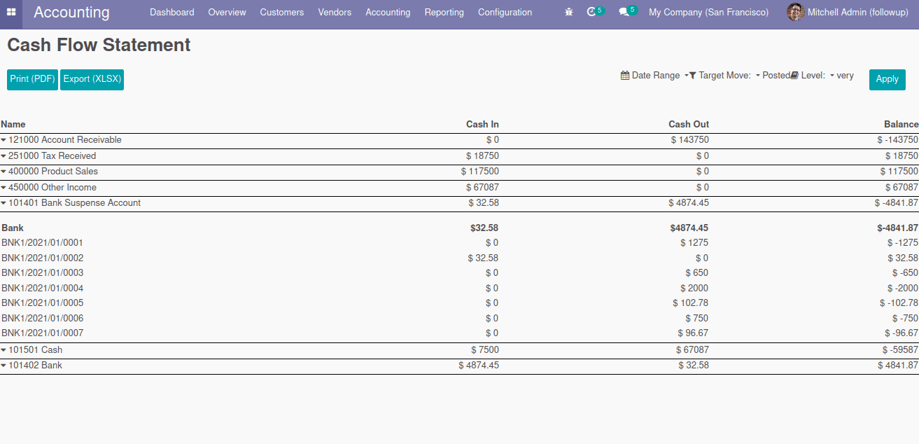 Next is the cash flow statements report. We can print it in pdf format or xlsx format. We can filter this using the options date range, journals, and target move.