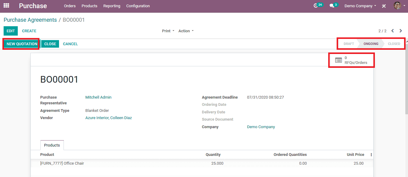 The Odoo platform allows the users to create Blanked orders which is an agreement for purchase both agreed by the company and the vendor.