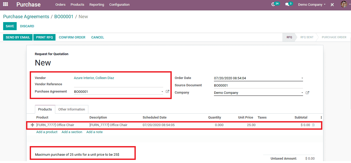 The purchase agreement for the quotation will be auto allocated by the Odoo and the vendor details will also be assigned the user can change them by selecting the edit option. The product description will be provided automatically without the number of quantities being allocated. The terms and conditions description will be depicted as per the one provided in the agreement. The user can edit the number of units of the product which should be allocated to the quotation.