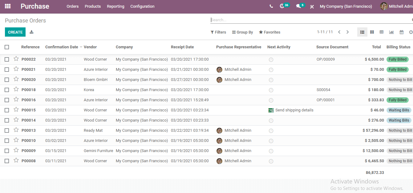 In the above page we can find the create button and using it we can create a purchase order. There we have to add the order confirmation date, vendor details, receipt date etc. This will also help us to add a purchase agreement. Using the purchase order we can also track the next activity.