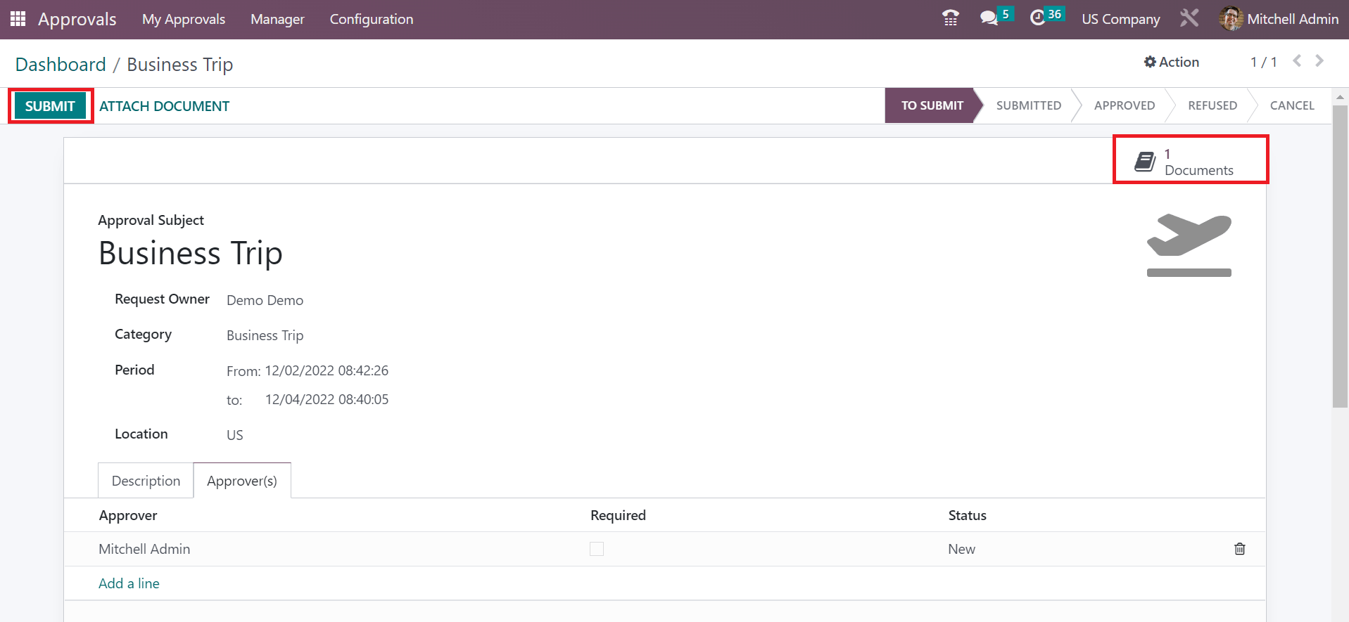After submitting the approval request, the stage changes from TO SUBMIT to SUBMITTED.