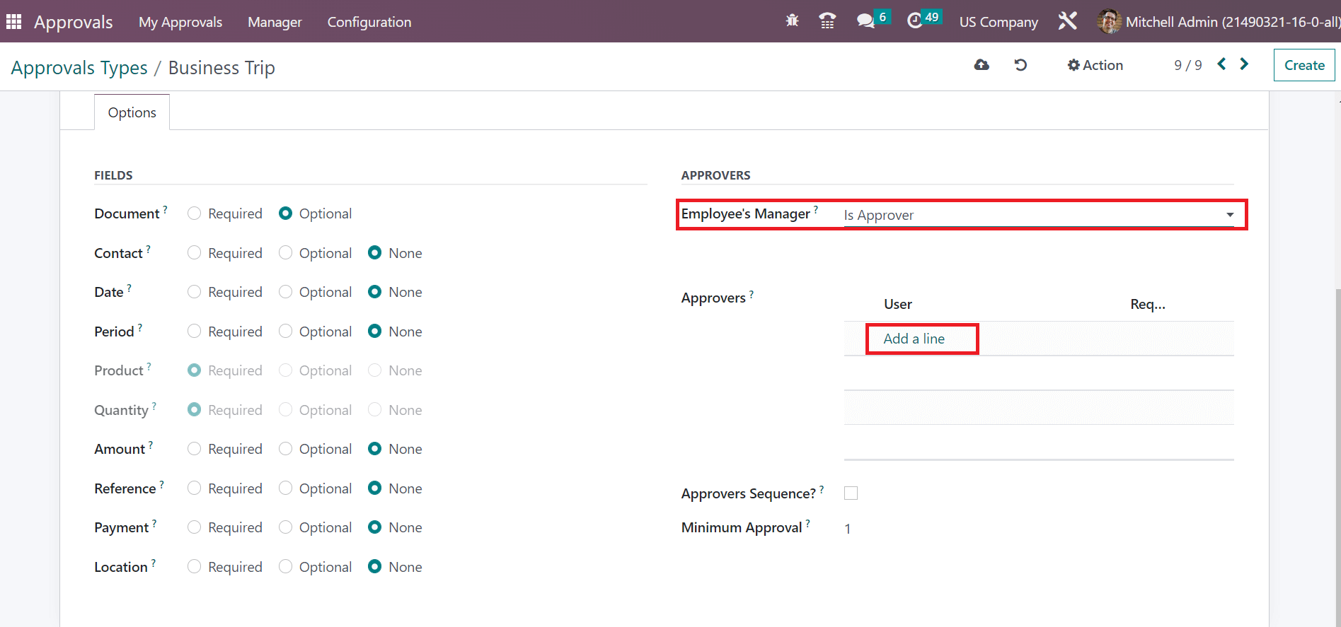 Next, we can define an approval for your Business Trip in the Odoo 16.