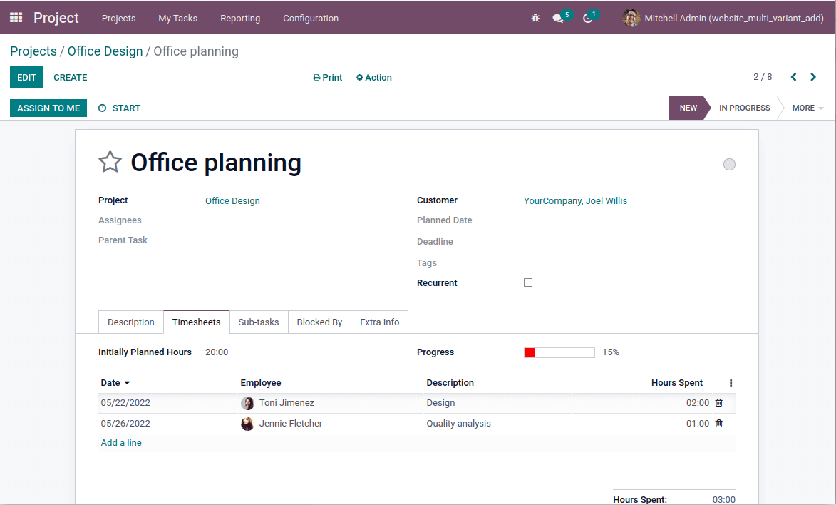 We can see the Progress Bar inside the task of the Project module. When we start to enter the time spent on each task, the width of the progress bar will increase with the percentage.