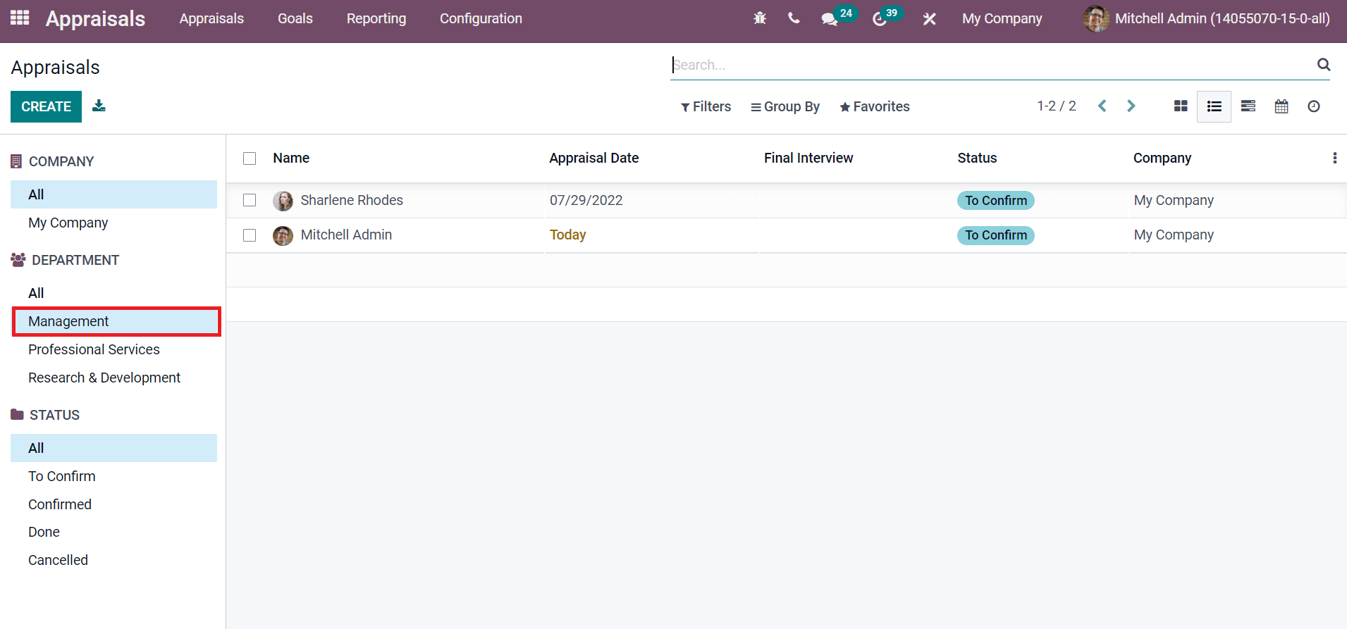 On the left side of the window, you can see Company, Department, and Status titles. We can sort out the employees' appraisal by selecting the department from the left side. For example, employee appraisals related to management are viewable in the window after selecting the Management department from the left corner.