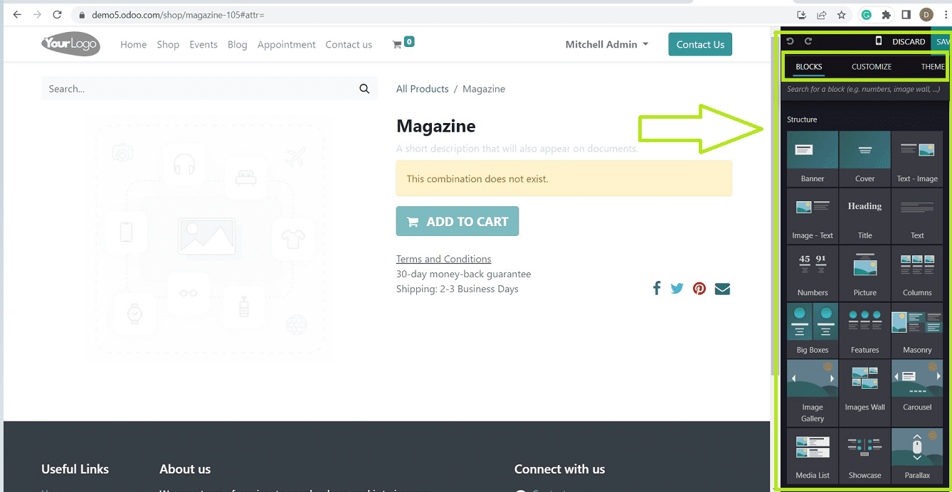 We can manage online publications, subscriptions, and customer portals using the “Go To Website” button, as we can see from the above picture, will lead us to a webpage where we can edit the webpage templates, shopping, blog, etc. depicted in the below screengrab.