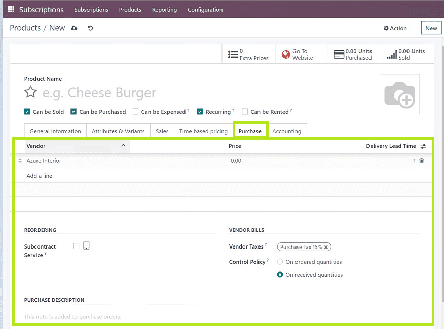 Users can create and manage everything related to their subscription products or services using the products menu available in the Odoo subscription module, as shown in the screenshot below.