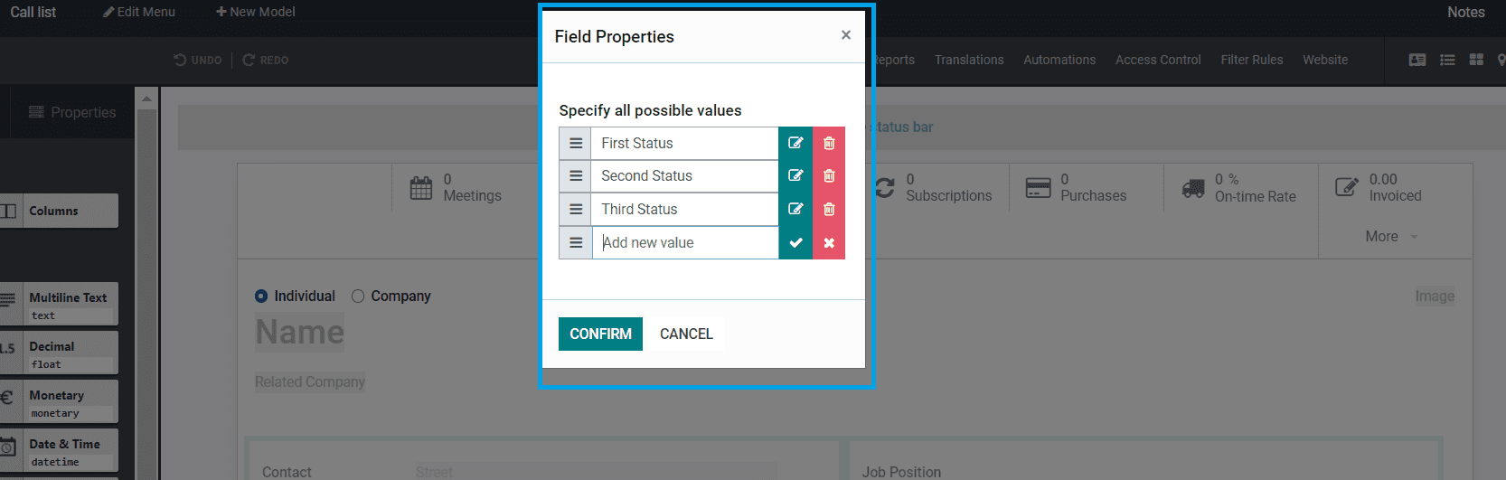 As seen in the above image, you will be getting this window for an existing model as you select, for example, if it is Contacts from the drop-down menu. The highlighted portion recognizes the redirected views by a click in the screenshot. It will enhance you with a Form view, List view, Kanban view, a Map view, Activity, and Search by clicking a specific icon as demonstrated. Here in the screenshot demonstrated with the Form view where you can add the Meetings, Opportunities, Sales, Subscriptions, Purchases, On-time Rate, Invoiced, and by clicking on the More button you get the Vendor Bills, Partner Ledger, and Go To Website buttons as the smart buttons. Here you can also observe that with an Add a pipeline Status Bar which is formed from enabling the suggested features as Pipeline stages. As seen in the screenshot below, you can use it here to add the possible values' status.
