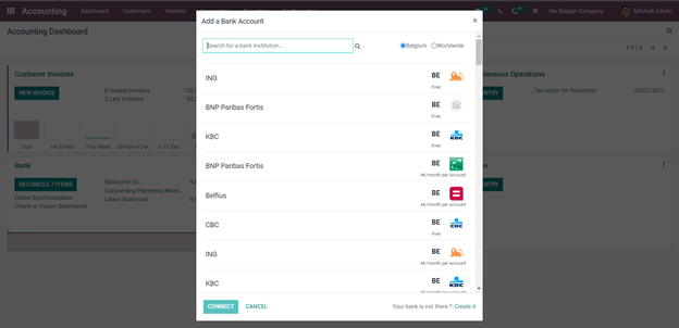 If you cannot find your Bank in the List then Create and Add it to Odoo. To do this go to the Bottom of the Configuration tab and click on the ‘Create it’ button as shown below