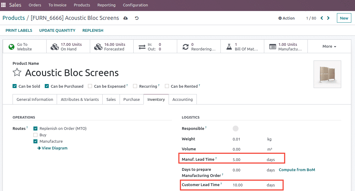 The time required to manufacture the goods is known as the manufacturing lead time. By selecting the Inventory tab of your product form and entering the number of days required for manufacture, you can set this parameter at the product level. In addition to helping you prioritize daily chores, this enables you to plan a start date for the order's manufacturing.