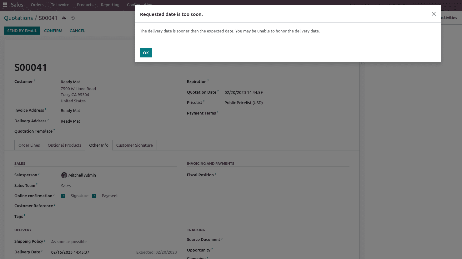 Here if the delivery date is scheduled before the expected date then a warning message comes which tells that the delivery date is sooner than the expected date. You may be unable to honor the delivery date.