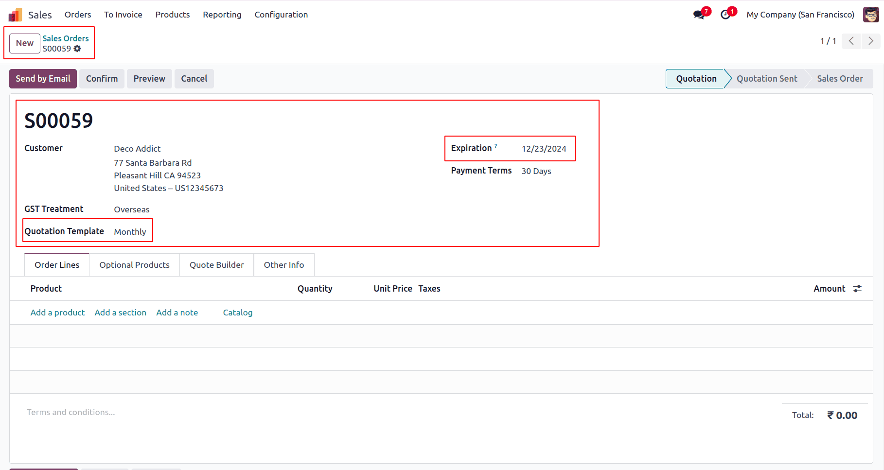 To utilize the previously created quotation template for your new sales order or quotation, simply select it from the “Quotation Template” field. This action will automatically populate the form with all relevant details and calculate the expiration date based on the quotation validity provided in the quotation template. After completing the order using the selected template, you can save the data and then confirm the details by clicking the “Confirm” button. The validity of the quotation will be displayed in the “Expiration” field, as discussed previously.
