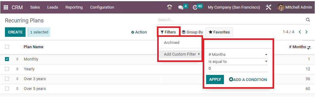 If you want to create a new recurring plan, you just need to offer a single click on the CREATE button available in the top left corner of the window. At the same moment, the system will automatically depict a new row in the same window where you can configure a new Recurring Plan.