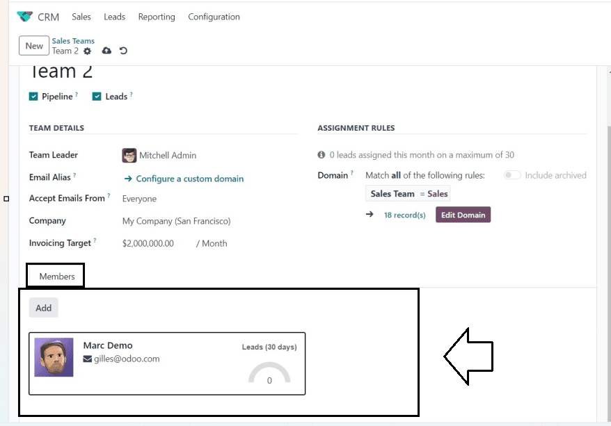 When you've finished setting up the Assignment rules, don't forget to save your data. The sales crew will then need to be expanded. The "Add" button located on the "Members" page may be used to add many sales team members. When clicked, the "Add" button will launch the wizard as depicted below.