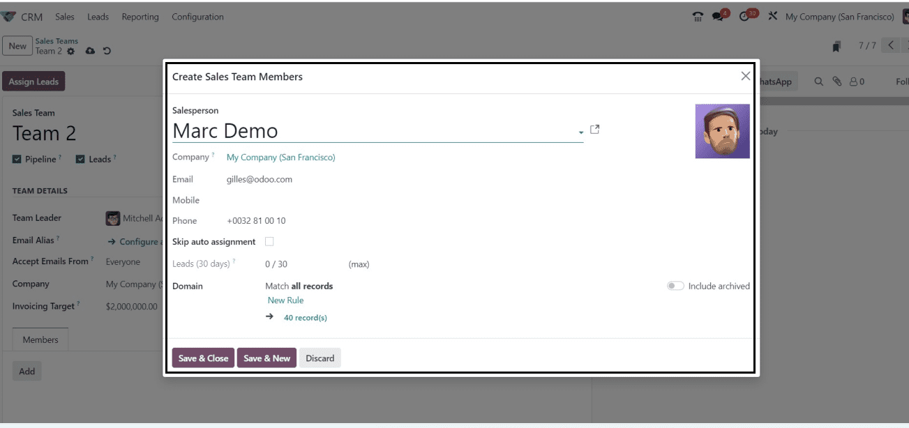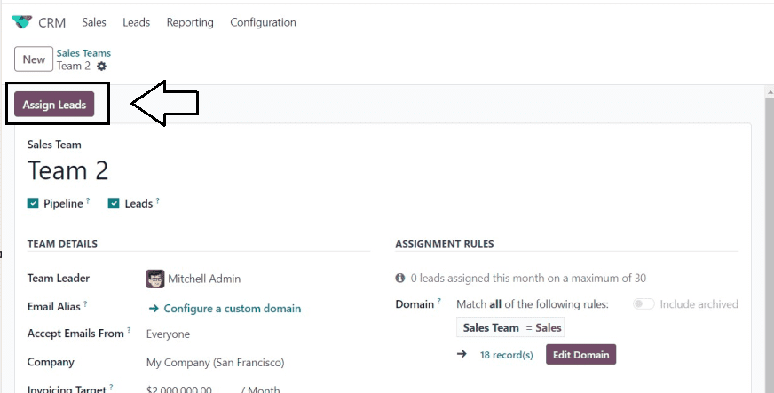Using the same approach, you can include multiple teammates in a team. Then, the Odoo 17 CRM Application will manually save information about your sales team immediately after taping the “save” icon. Now, we can assign leads to a specific team member and website by selecting the “Assign Leads” button placed at the top left corner of the configuration form.