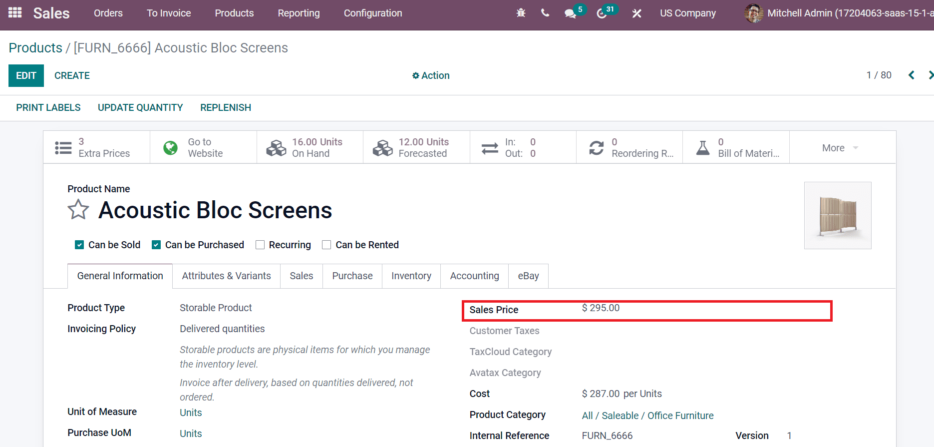 Now, we can see the old sales price of Acoustic Bloc screens by clicking on the Products menu. Choose your product, and you can view that Sales Price is $295.