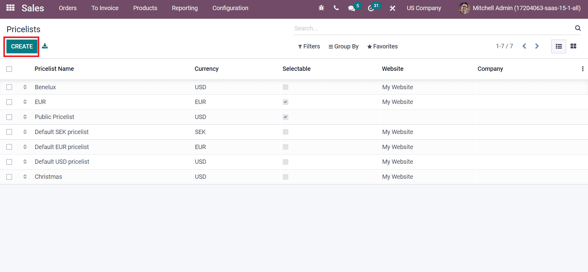 We can create invoices, customers, orders, coupon programs, shipping methods, and more using Odoo 15 Sales module. The pricelist management for your company is made easy through the Sales module of Odoo 15. Now, let's see how to manage a price list for a US company in Odoo 15 database.