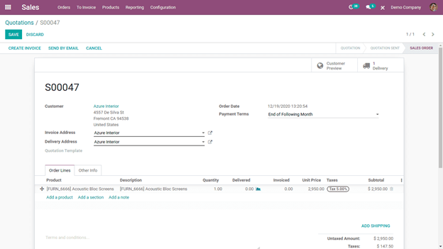 Now assign the fiscal position to some customer and create a sale order for him for the 'Acoustic block screen' and confirm.