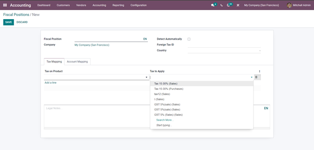 Another feature of the fiscal position is account mapping. As tax is mapping, accounts can also be mapped based on country or customers.