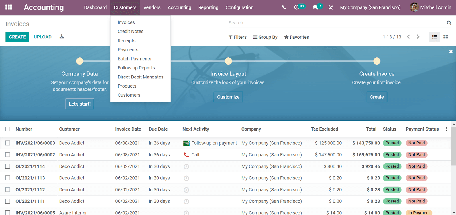 With the accounting modules of the Odoo, you can manage the finance operations of the company. The invoice operations management along with the function of generation of invoices can be automated with Odoo once the sales order is confirmed. Similar aspects can also be configured with the vendor bill payment operations. In addition, in Odoo you can define various payments acquired for accepting online as well as card payments this will add up to the aspects of the localization of the platform. Since it will allow you to define various region-based payment acquirers and terms of operation. In addition, from the accounting module, you can run the finance management positions such as invoicing, accepting payment, and sending money to vendors, and many more. The following image depicts the dashboard of the accounting module.