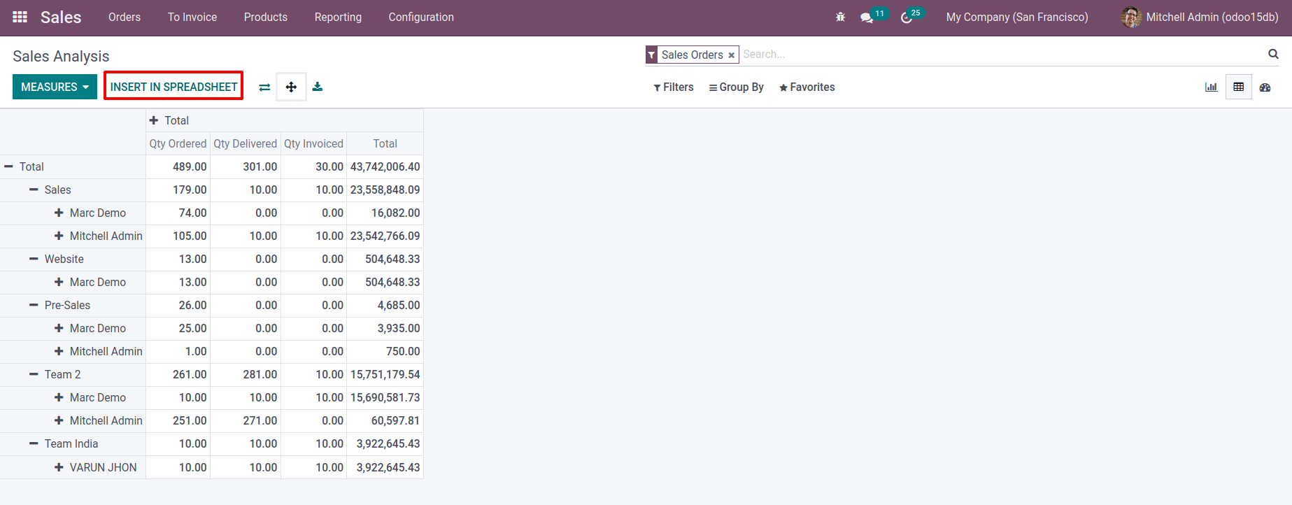 Taking a report with the sales team, salesperson on one axis and order details such as Quantity ordered, Quantity delivered, Quantity invoiced, and Total on the other. As previously stated, adding a parameter is as simple as clicking the + symbol. Then click the expand icon to expand the table. By clicking the Flip axis button, we can flip the axis. It's also possible to Download this page.