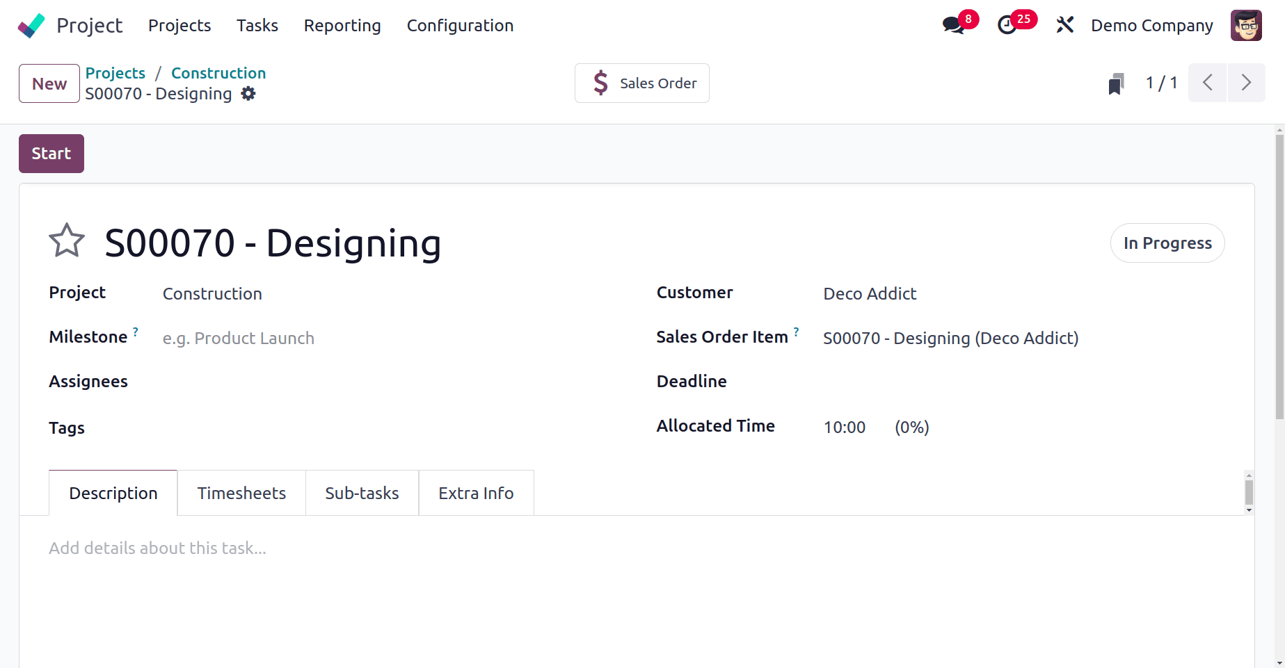 By referencing the Project in the product, which will generate a Task as creating an Order is given, the sophisticated Odoo feature enables the creation of a link between the construct quotation and the sales module. By doing this, a task with the sales order data is created within the project in question, as seen below.