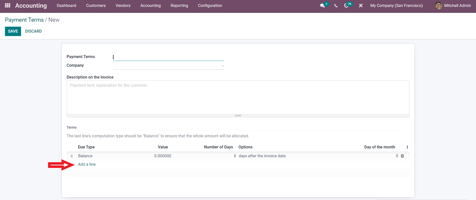 Add the customer, and the Payment Terms field will be automatically filled concerning the configurations you have given on the Accounting module shown below.