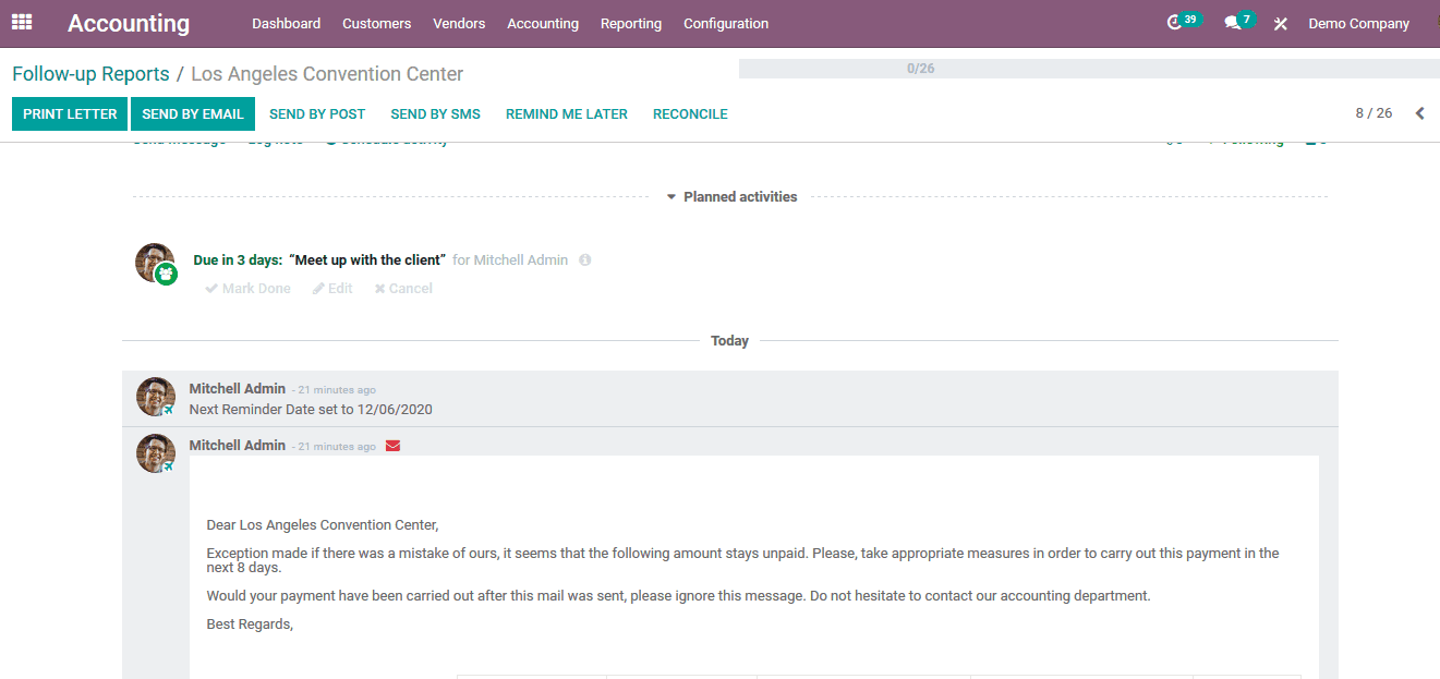 The customer can pay the bill amount in installments or down payment option by percentage or a fixed charge. There are various other localization options available that have been employed by business establishments all over the world. Further to say, there are instances where the customers would not be able to pay for the product or service at the instance. In addition, the customer may forget about it due to smoke mishaps or invoice misplacement. This is where the follow-up option comes in. Usually, the follow-ups are conducted with a simple phone call or in an uncivilized manner. Odoo on the other hand has a dedicated management tool to deal with the follow-up operations of the company.
