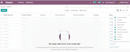 We can also use the filter feature to manage the operation. We can filter the repair orders by Quotations, Confirmed, Ready to Repair, Invoiced and based on created on date