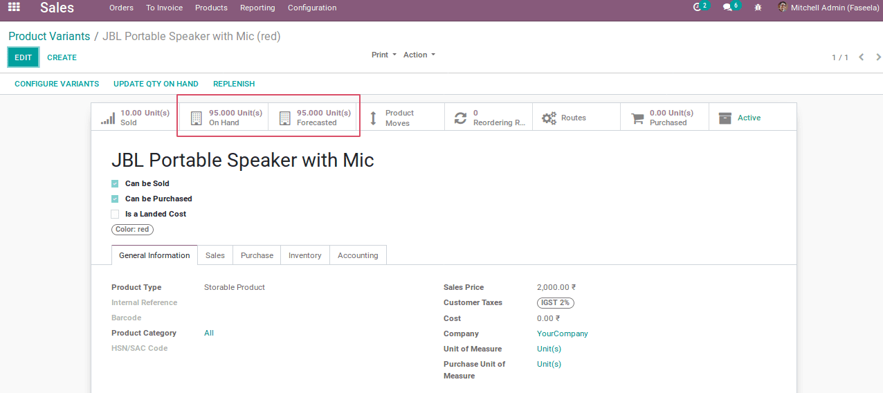 In the above image, a new sales order is created, with ordered quantity 10. Let's check the quantity on hand of the product.