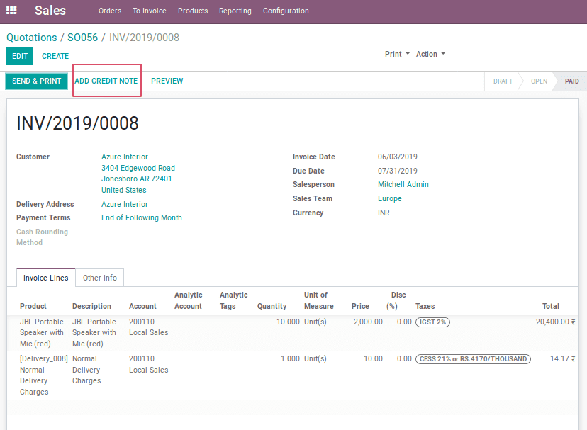Additionally, the credit note is used as a refund of the ordered quantity. Here the credit note is in the state of paid. Moreover, the ordered quantity, price, tax, and delivery charge cannot be changed in the credit note. So the partial return is not possible in this case.