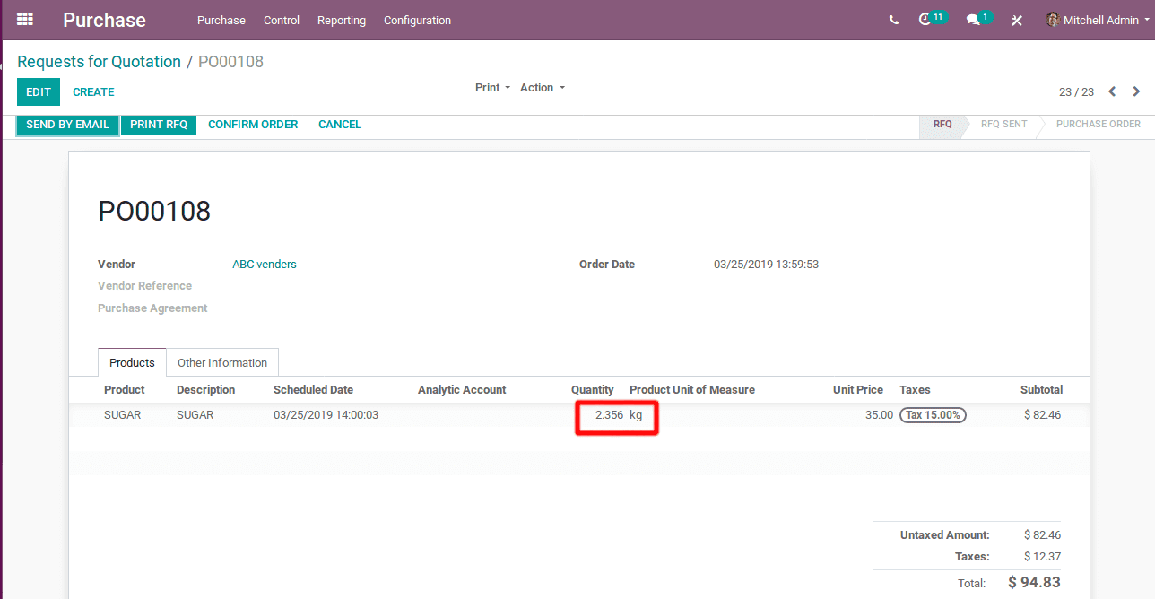 For example, in the purchase order, if we give the quantity as 2.356, the rounding precision will automatically affect the quantity and the quantity gets changed to 2.400.