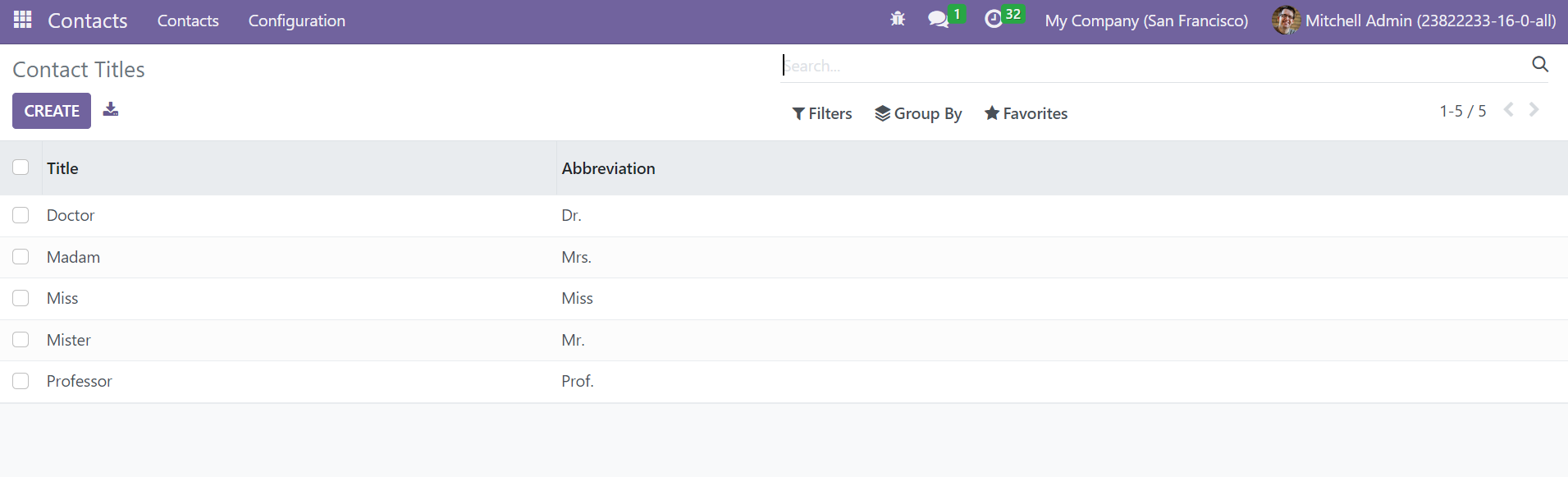 On the page, you have the details, such as the Title and Abbreviation. To make such a contact title, you can go to the Create icon. On the extra space provided, you can just add the contact title with very few clicks. Finally, go to the save button.