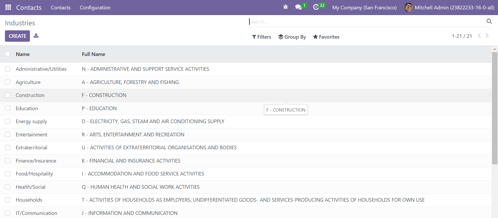 The next option on the Configuration menu is Industries. On selecting the option, you will get the list of already created industries, as shown below.