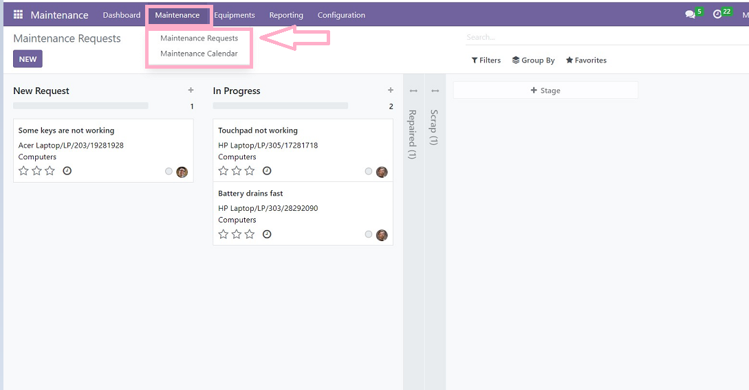 In this “Maintenance Request” window, you can see the open maintenance requests as well as their current status. We can see the created request dashboard view from the above screenshot after opening the “Maintenance Request” homepage. Here the requests are arranged in a project-based manner. You can view the ongoing maintenance requests and their current stages in this Maintenance Request window. This indicates that the state is changed to the “In Progress” stage if the Maintenance Request is in the Progress condition. The equipment's state will automatically change to "Repaired" when it is repaired. On the other hand, the state will change to "Scrap" if the equipment is scrapped. Additionally, the platform gives you the option to fold up or unfolding of the stages and add more stages by choosing the "+Stage" option.