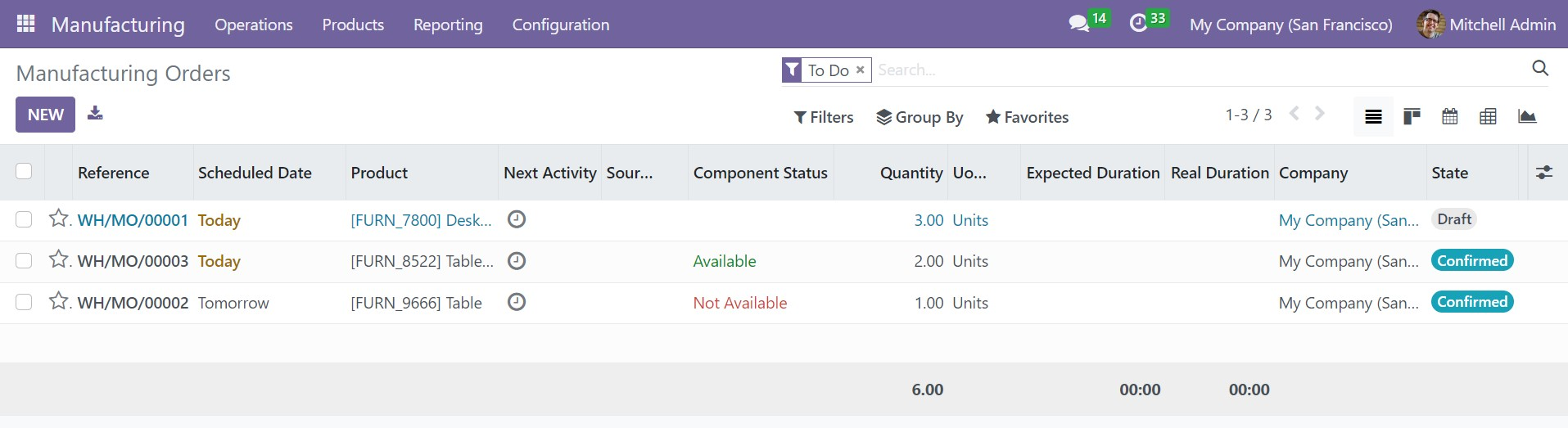 The page shows the manufacturing orders, as shown in the screenshot above. There you will get already configured manufacturing needs. The details include reference, schedule date, product, next activity, source, component availability, quantity, UoM, expected duration, real duration, company name, and the status of the manufacturing order, respectively. The page can be seen in the list view as well, other than the Kanban view. Other than the list and Kanban, you can make use of the calendar, activity, and pivot views also. According to the user's need, the view can be selected. The pivot view and graphical view can be used to make reports of every manufacturing order that is made in the module.