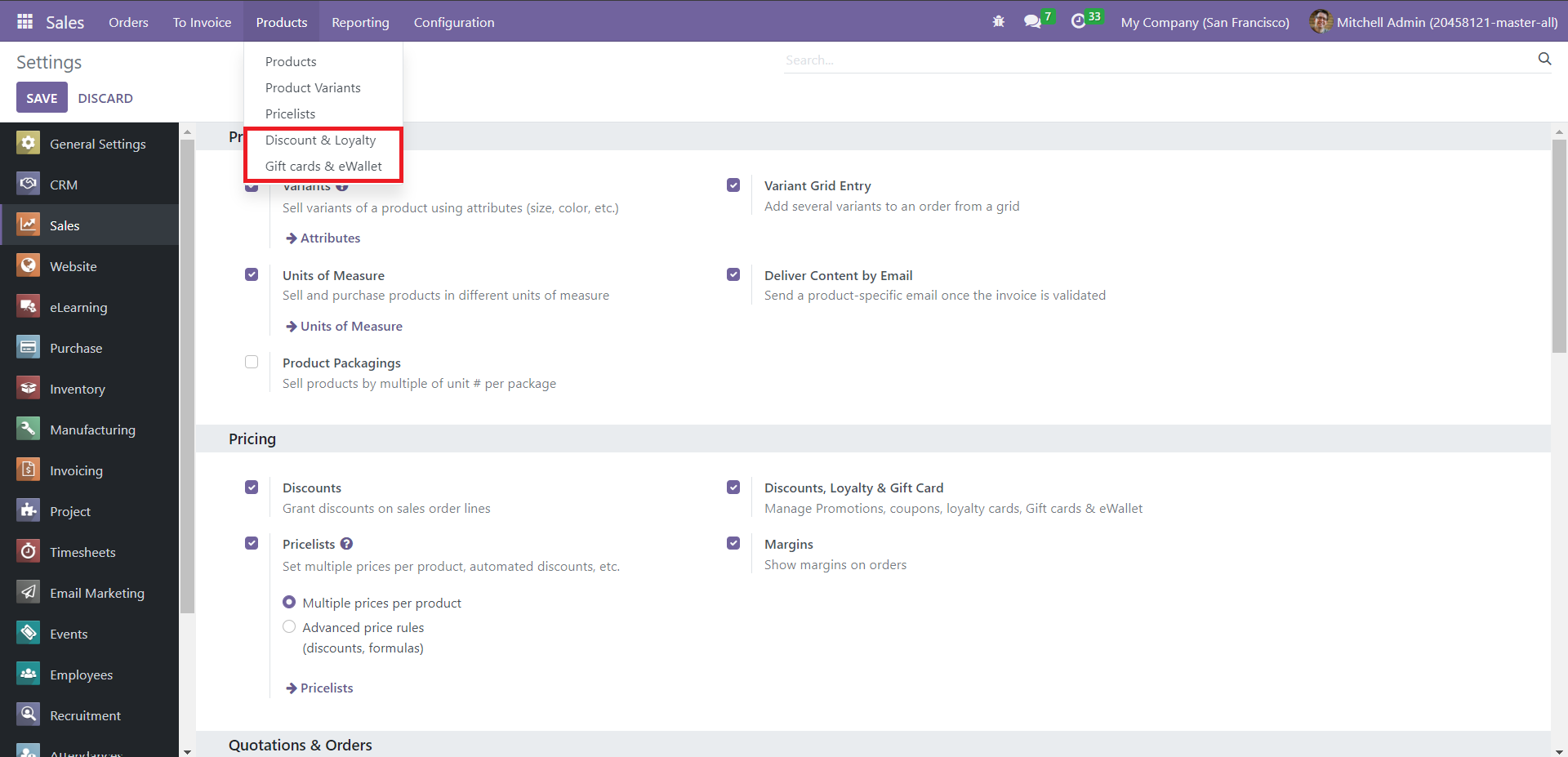 Promotions, coupons, gift cards, etc., can boost your product’s reach and improve sales. To enable this feature, select the Settings option from the Configuration menu. Activate ‘Discounts, Loyalty & Gift Card’ in the Pricing section.