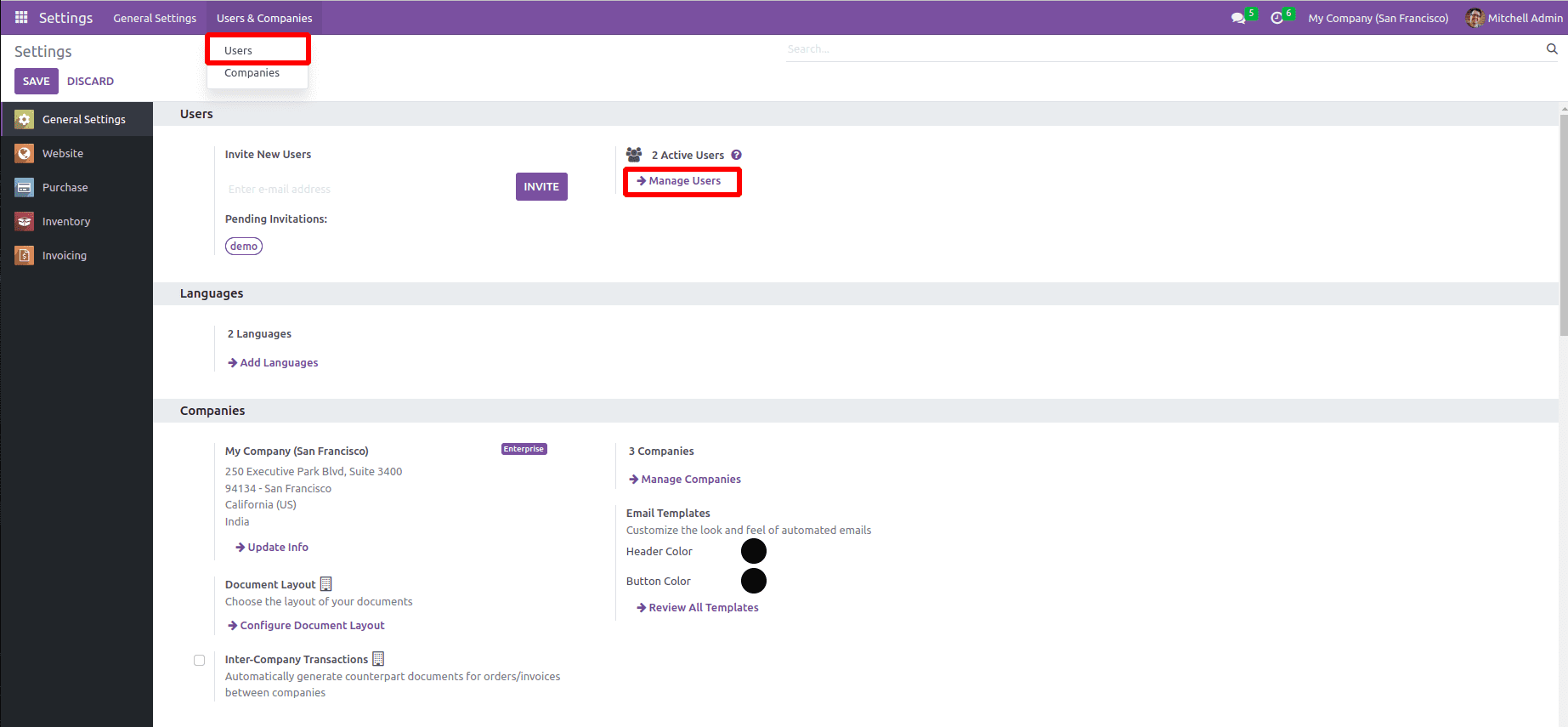 Go to Users & Companies-<Users in the Settings app or select Manage Users in the Users section to set the user preferences for other users.