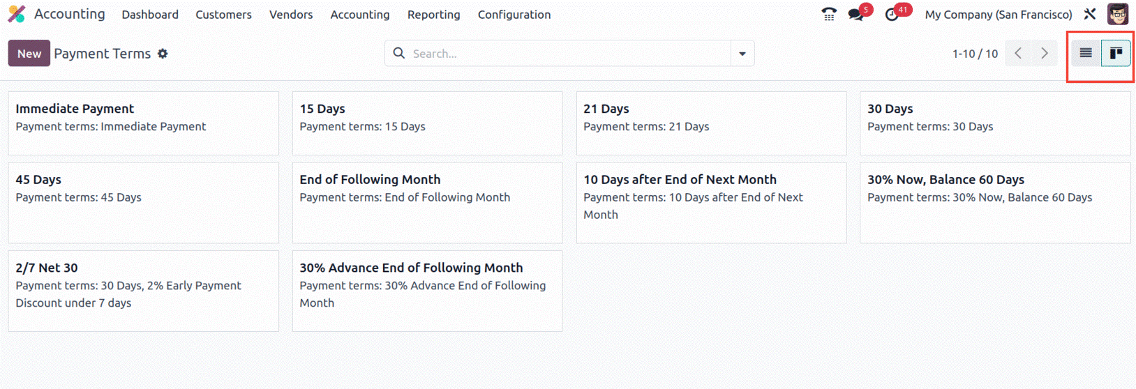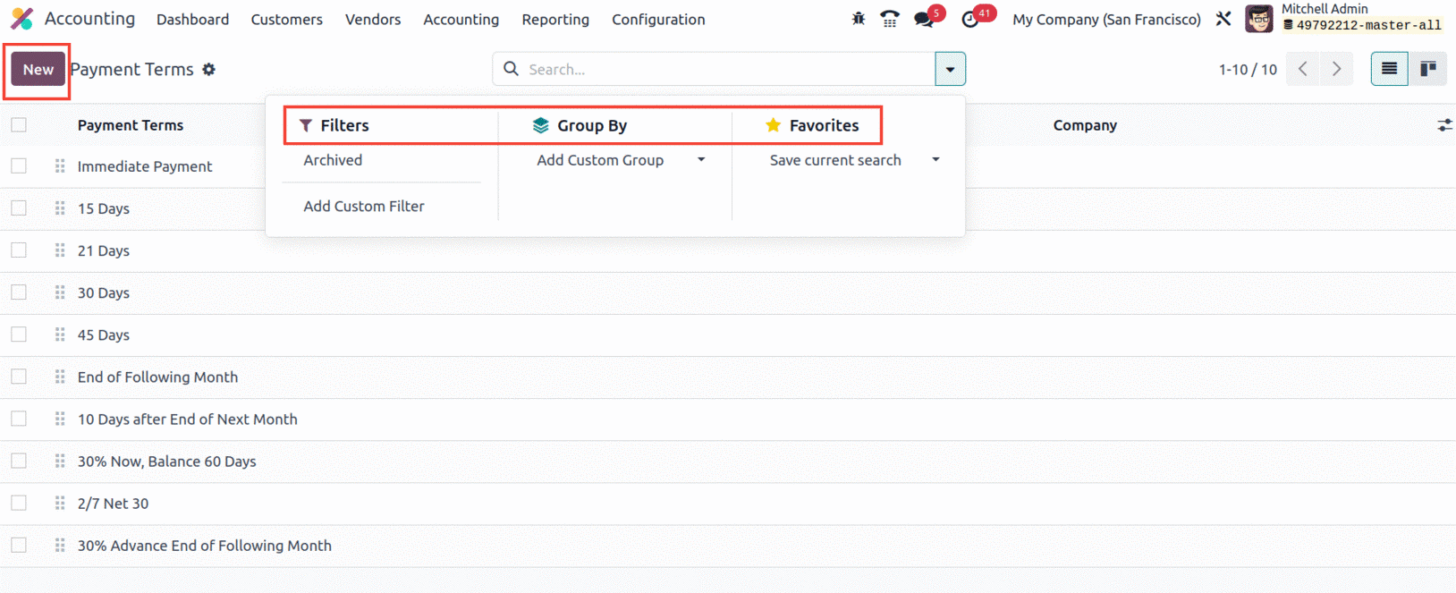 You can select the NEW button to open the creation form when you want to create new Payment Terms, as