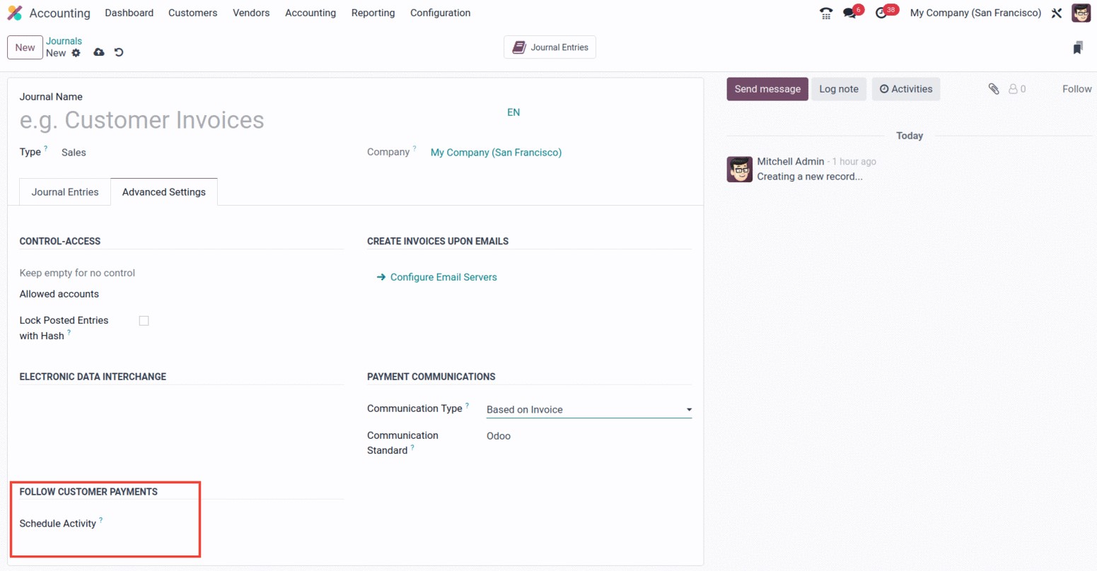 the Odoo 17 Accounting module enables the construction and administration of custom journals.