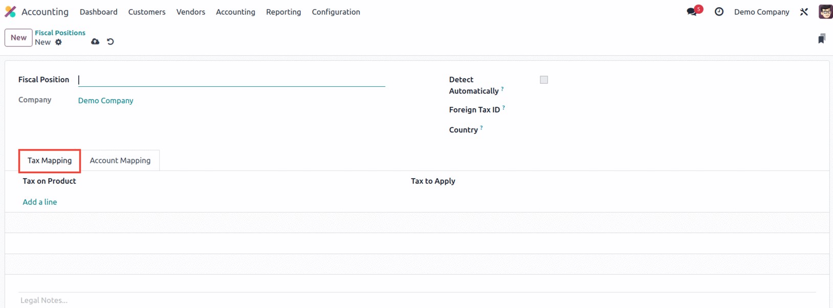 the Fiscal Positions creation form. In the space provided, you may also add Legal Notes here.
