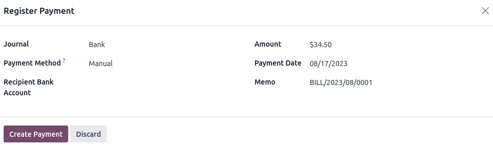 Once the vendor bill has been generated, you can choose to confirm the payment by selecting the option to register the payment. The Register Payment menu will appear for you, as shown in the accompanying screenshot. In this case, the payment mechanism can be either manual, SEPA credit transfer, or checks. It is possible to define the Receipt Bank Account information as well as the Amount, Payment Date, and Memo information. You should choose from the various Create Payment choices once all the aspects have been defined.