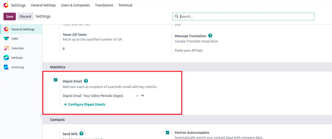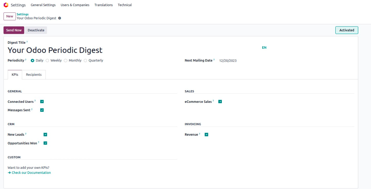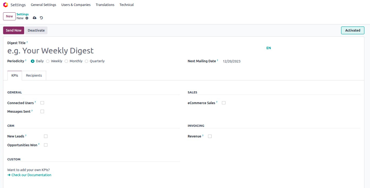 Once it's enabled, a list of digest emails will appear. Odoo includes