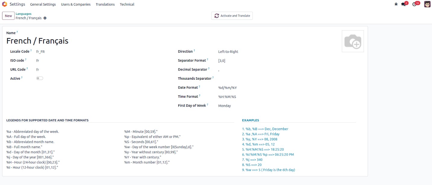 In the form view of a language in Odoo 18, you can customize various