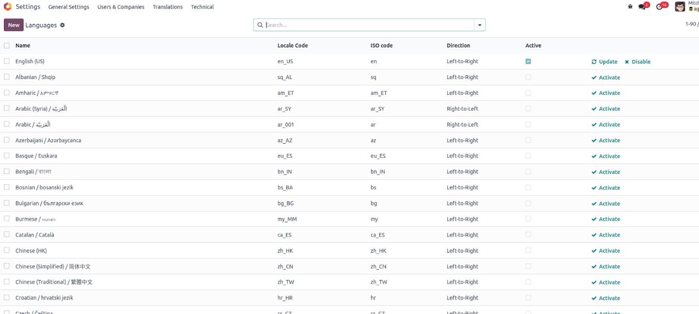 Select a language from the list to configure its settings in Odoo 18.