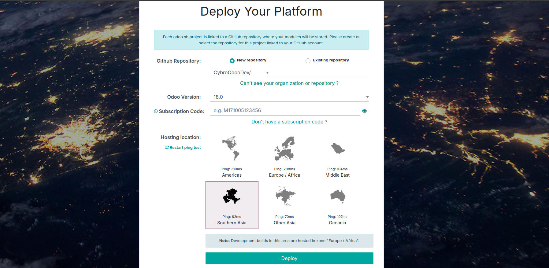 Once you're logged in to Odoo.sh, continue by providing the necessary
