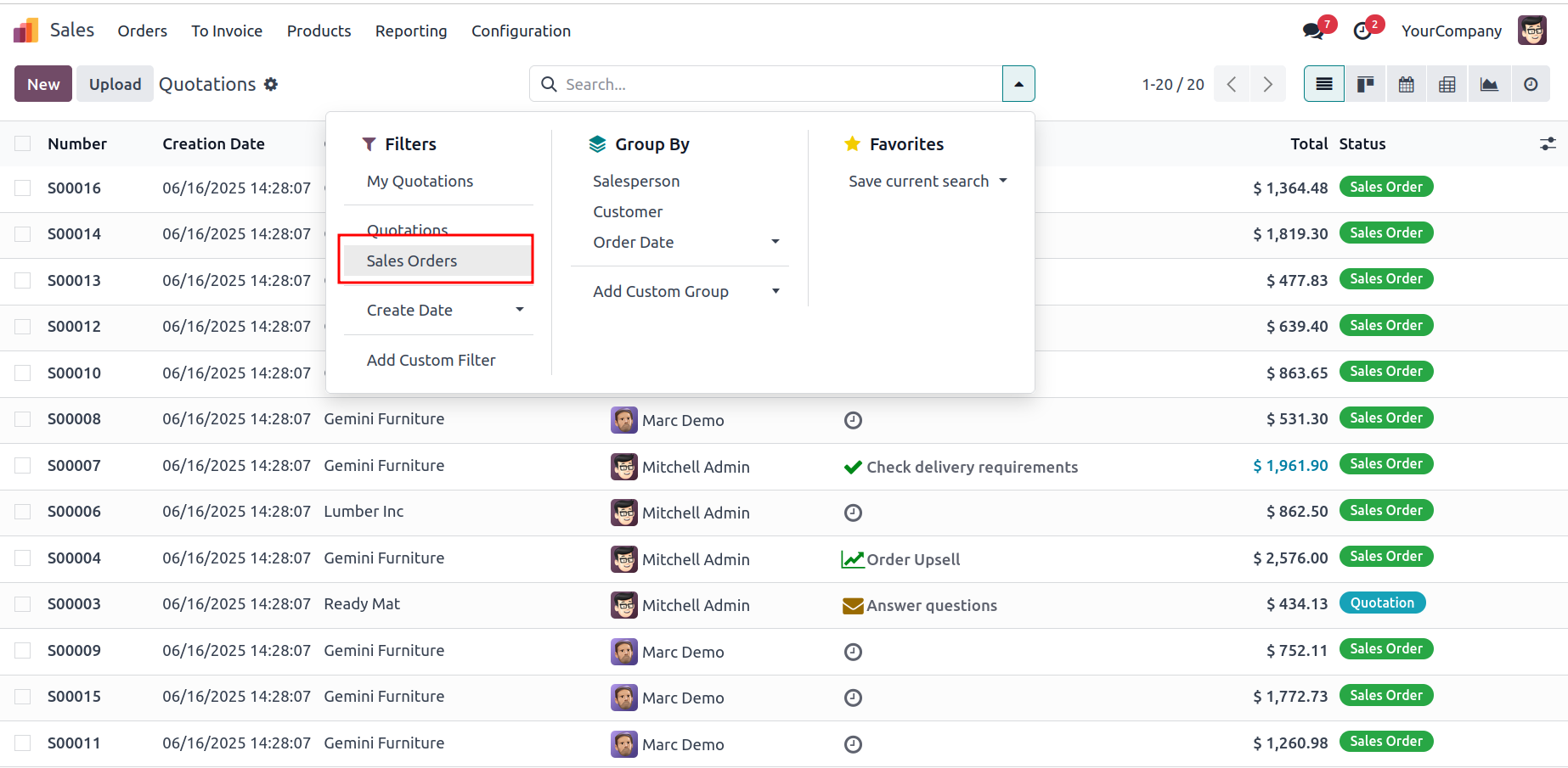 The search view in Odoo allows you to define default filters to help