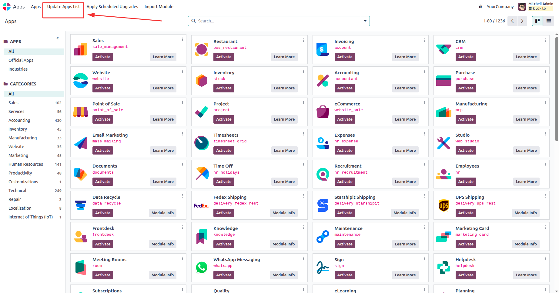 added Apps and modules, select "Update Apps List" from the menu.